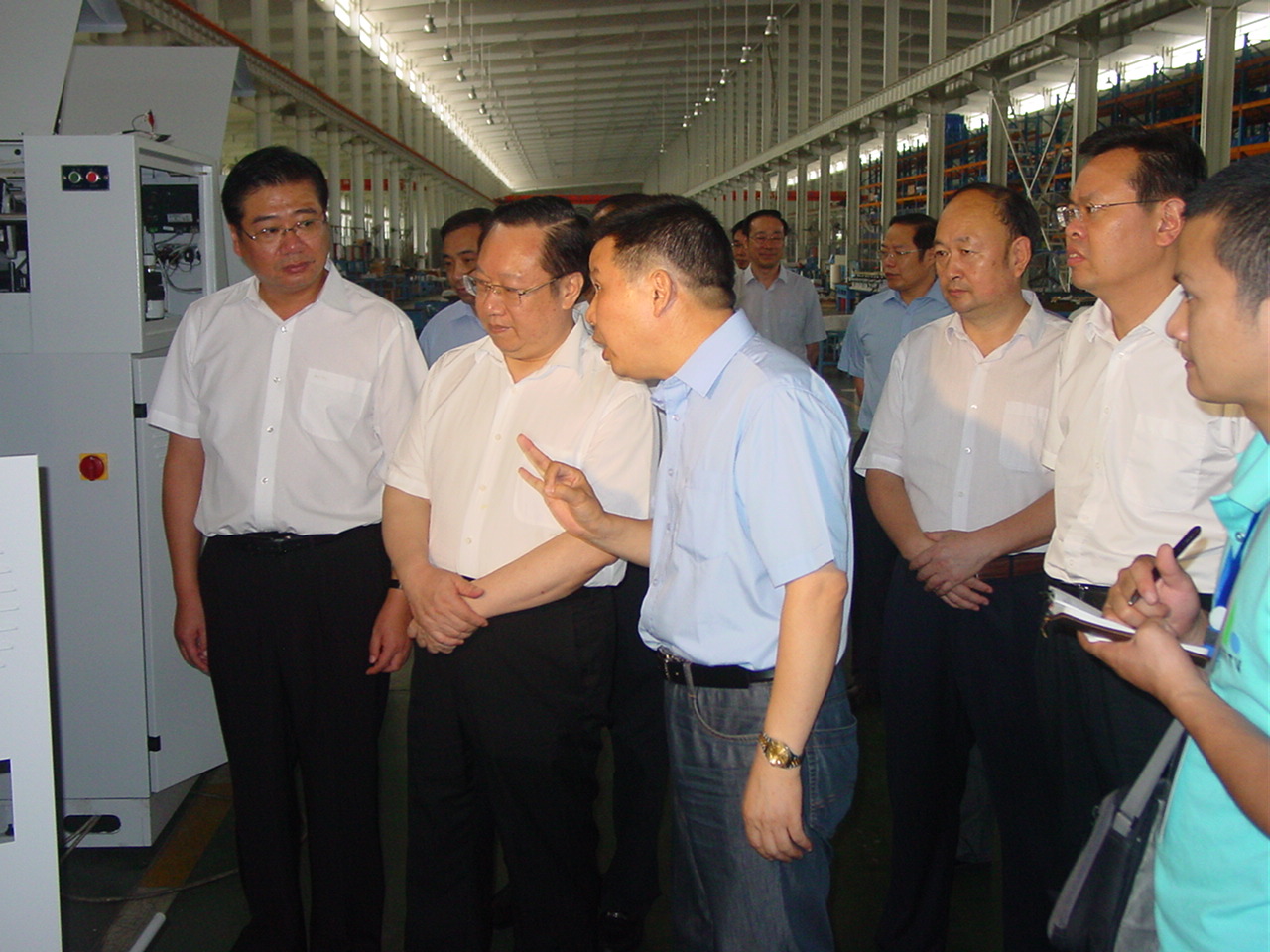 圖為王曉東(左二)在天門市委書記柯?。ㄗ笠唬┑仁蓄I(lǐng)導(dǎo)的陪同下,在天門紡機(jī)總裝車間視察并聽取公司董事長(zhǎng)沈方勇(左三)工作匯報(bào)的場(chǎng)景。