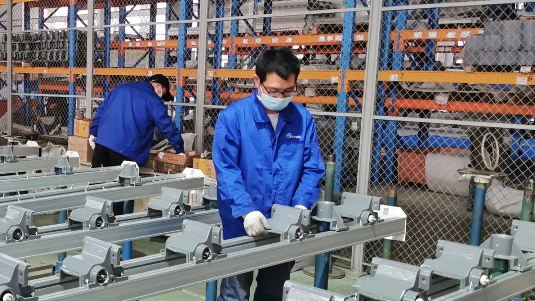 裝配工曾獻(xiàn)軍對(duì)裝箱的導(dǎo)條架進(jìn)行檢查
