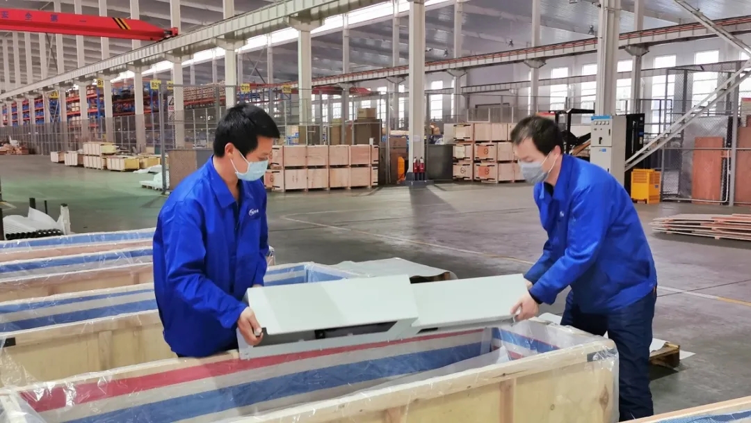 青年員工楊利軍、趙志祥進(jìn)行附件的裝箱工作