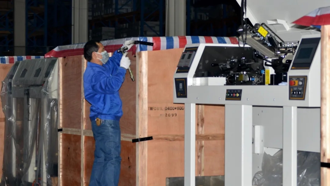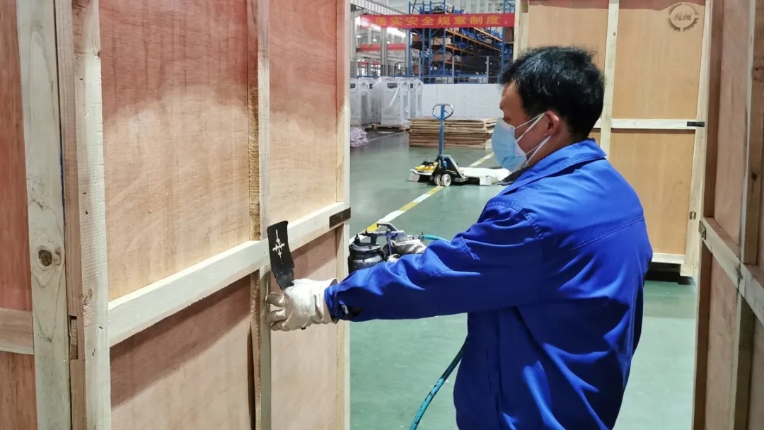 總裝車間主任彭文武對(duì)發(fā)貨產(chǎn)品包裝作邊角固定