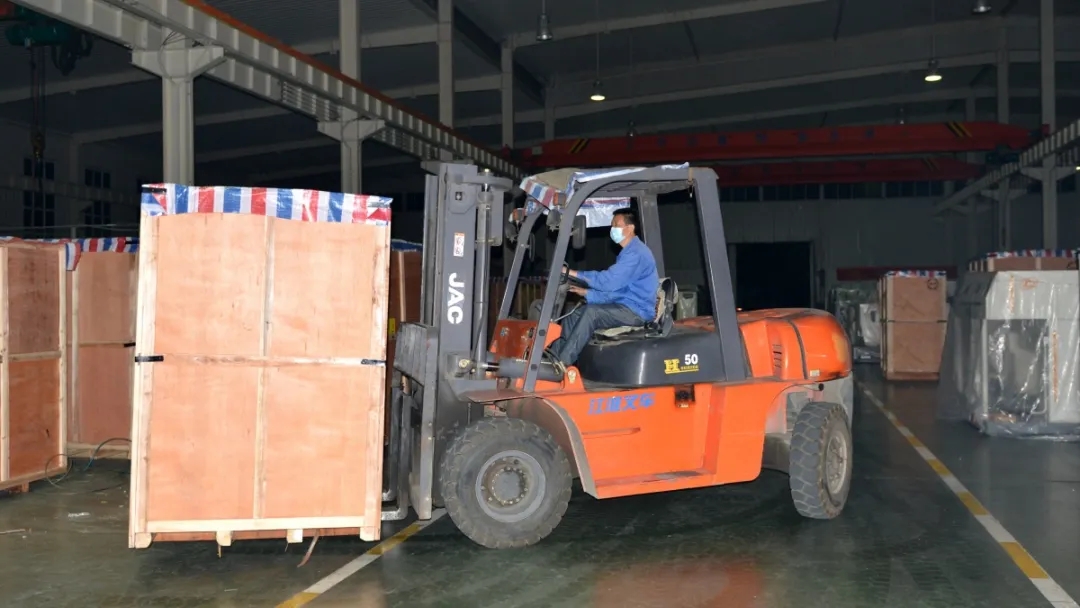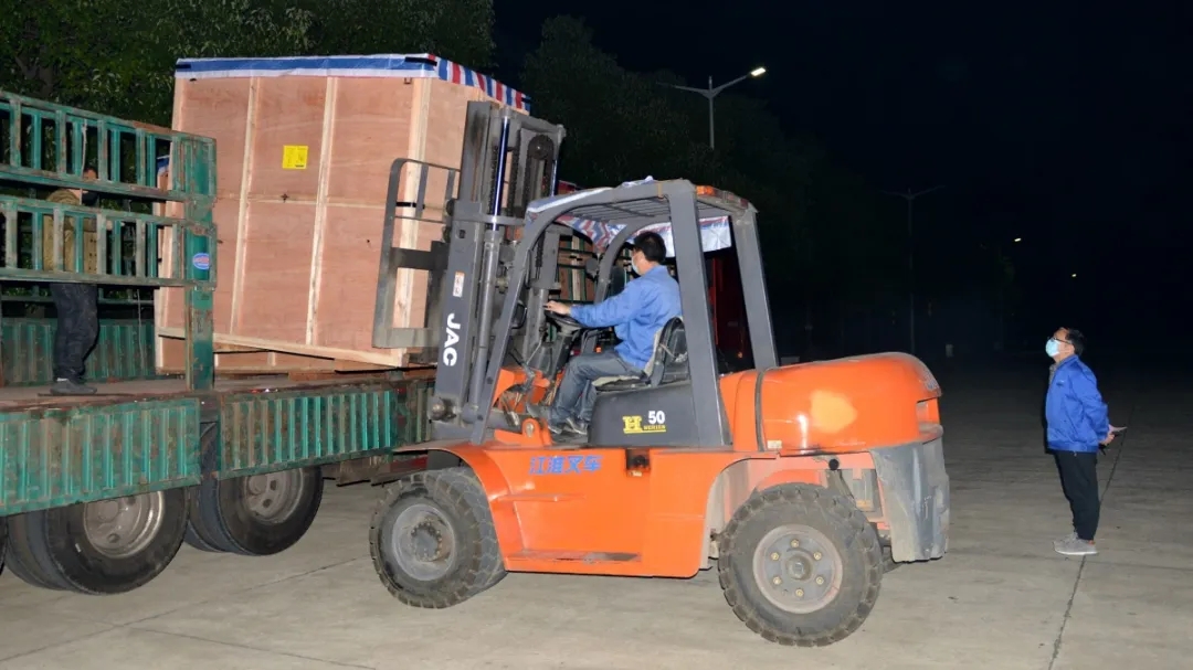 夜幕降臨,公司叉車司機(jī)姚順華抓緊時(shí)間將包裝好的產(chǎn)品進(jìn)行裝車作業(yè)