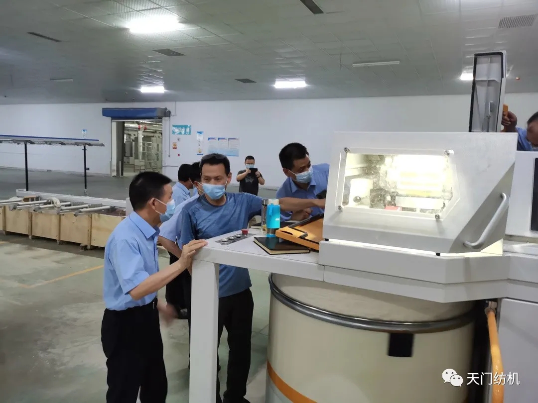 天門紡機(jī)“全球首款超大卷裝雙眼高速自調(diào)勻整并條機(jī)”—TM19自6月份上海展會首次亮相后,已布點(diǎn)在不同客戶處并線試紡3月有余。為了解該機(jī)并線后的真實(shí)使用情況,9月18日,天門紡機(jī)董事長沈方勇、總經(jīng)理焦倫進(jìn)帶領(lǐng)技術(shù)研發(fā)人員組成的TM19評估組,專程赴卓爾天龍紡織公司,現(xiàn)場考察實(shí)際使用情況,征求客戶意見建議。